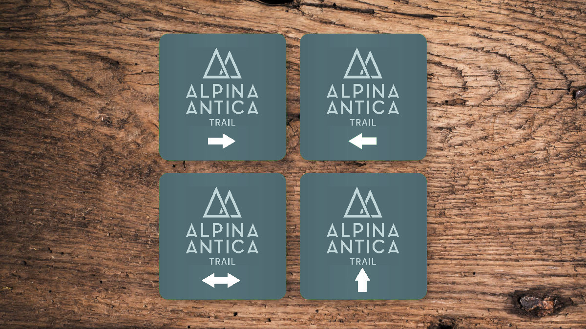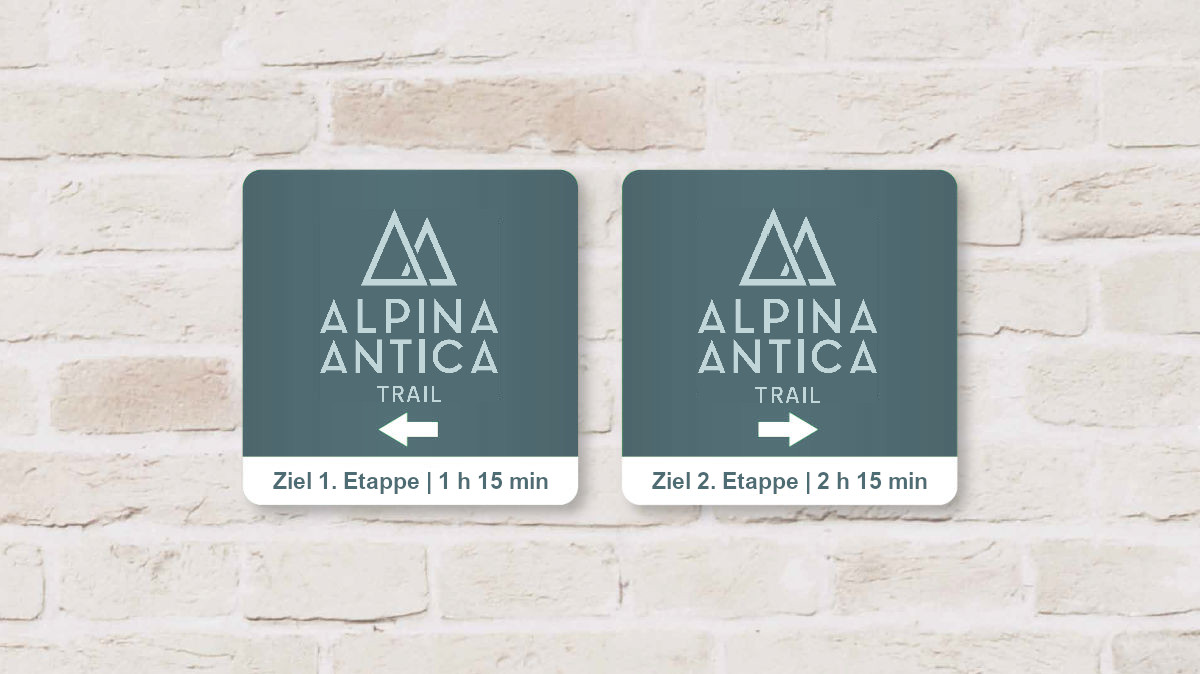 Die Beschilderung der Hauptroute ist am gesamten Alpina Antica Trail einheitlich und weist den Weg von Etappe zu Etappe immer in Richtung Süden. Unten sind Beispiele der 20 x 20 cm großen, Schilder, wie sie entlang des Alpina Antica Trails angebracht sind. Zusätzlich sind bei Highlights Infotafeln aufgestellt, die neben wertvollen Tipps auch die jeweilige Route enthalten.